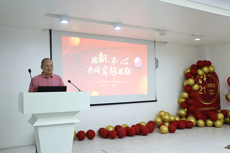 本次周年慶活動(dòng)在創(chuàng)世科技總經(jīng)理張傳金的精彩致辭中拉開(kāi)序幕,首先他帶領(lǐng)全體員工回顧了公司過(guò)去二十一年來(lái)所取得的成績(jī)以及克服的各種困難,感謝全體員工一直以來(lái)的辛勤付出與奉獻(xiàn),鼓勵(lì)大家繼續(xù)發(fā)揚(yáng)創(chuàng)世人不屈不撓的奮斗精神,勇敢面對(duì)復(fù)雜的外部環(huán)境和激烈的市場(chǎng)競(jìng)爭(zhēng),堅(jiān)持做難而正確的事,不斷的創(chuàng)新,用更多新產(chǎn)品、新技術(shù)、新模式去穿越周期。他表示我們抵御了疫情,也必將能戰(zhàn)勝其他一切挑戰(zhàn)。