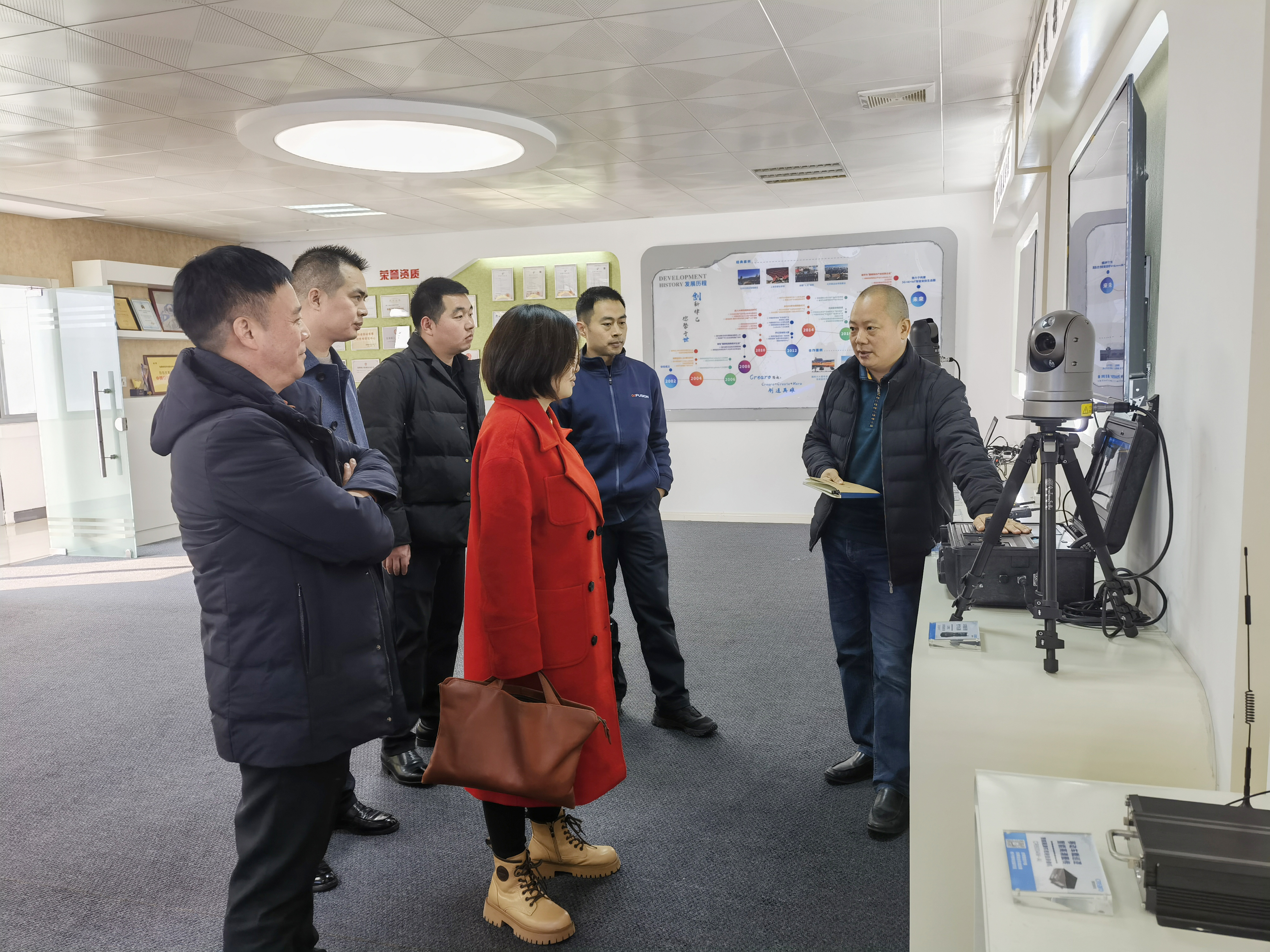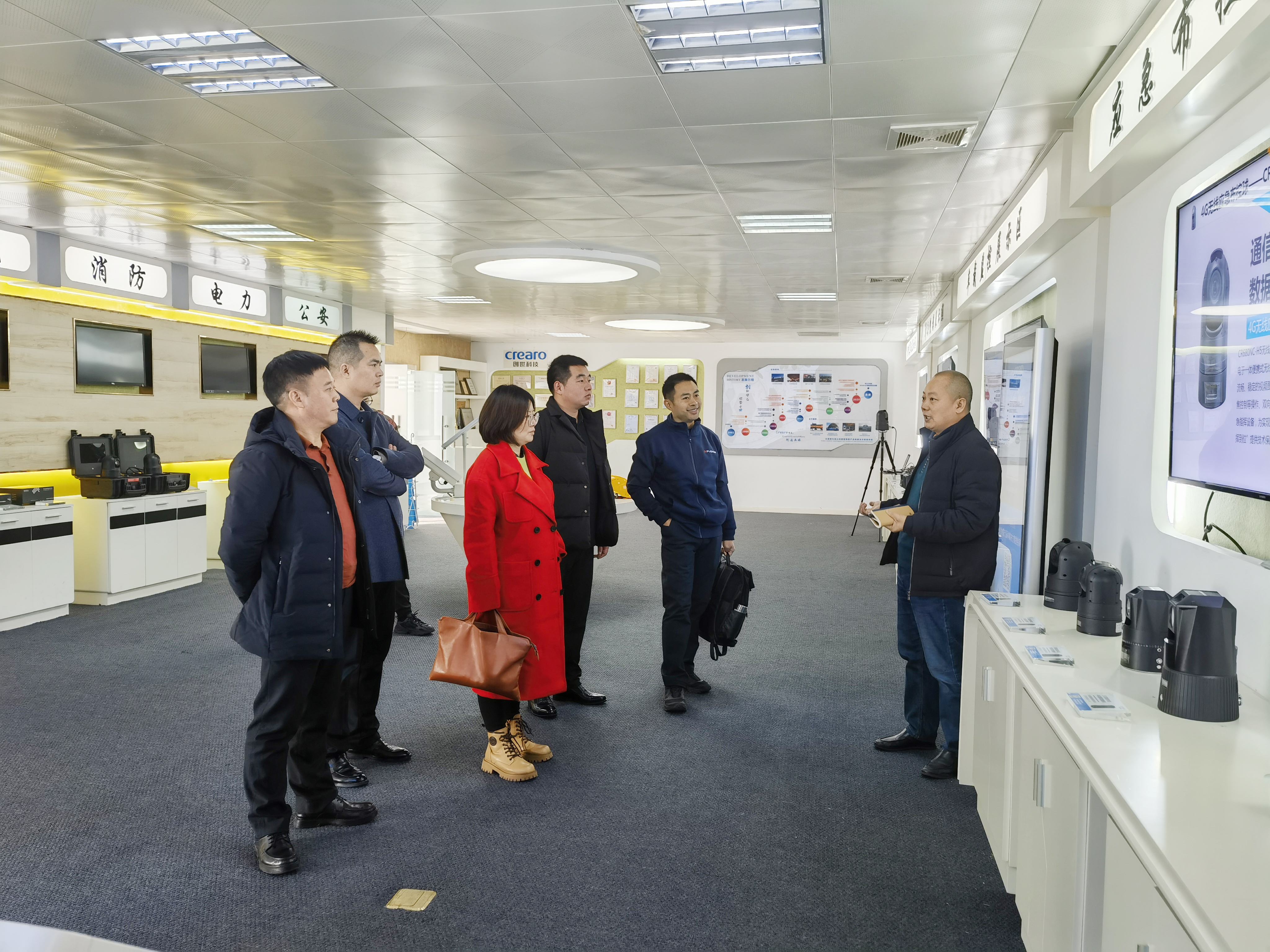 調(diào)研組一行首先參觀了公司的智能展廳,聽取了創(chuàng)世科技在移動(dòng)視頻監(jiān)控領(lǐng)域創(chuàng)新方面的工作;并深入體驗(yàn)了在AI領(lǐng)域的創(chuàng)新產(chǎn)品與科研成果,如智能執(zhí)法記錄儀、應(yīng)急移動(dòng)便攜平臺(tái)、智能車載、一體化警燈和智能布控球等軟硬件產(chǎn)品,調(diào)研組對(duì)企業(yè)在移動(dòng)數(shù)據(jù)采集以及智能大數(shù)據(jù)云平臺(tái)等方面所取得的成果給予充分肯定。