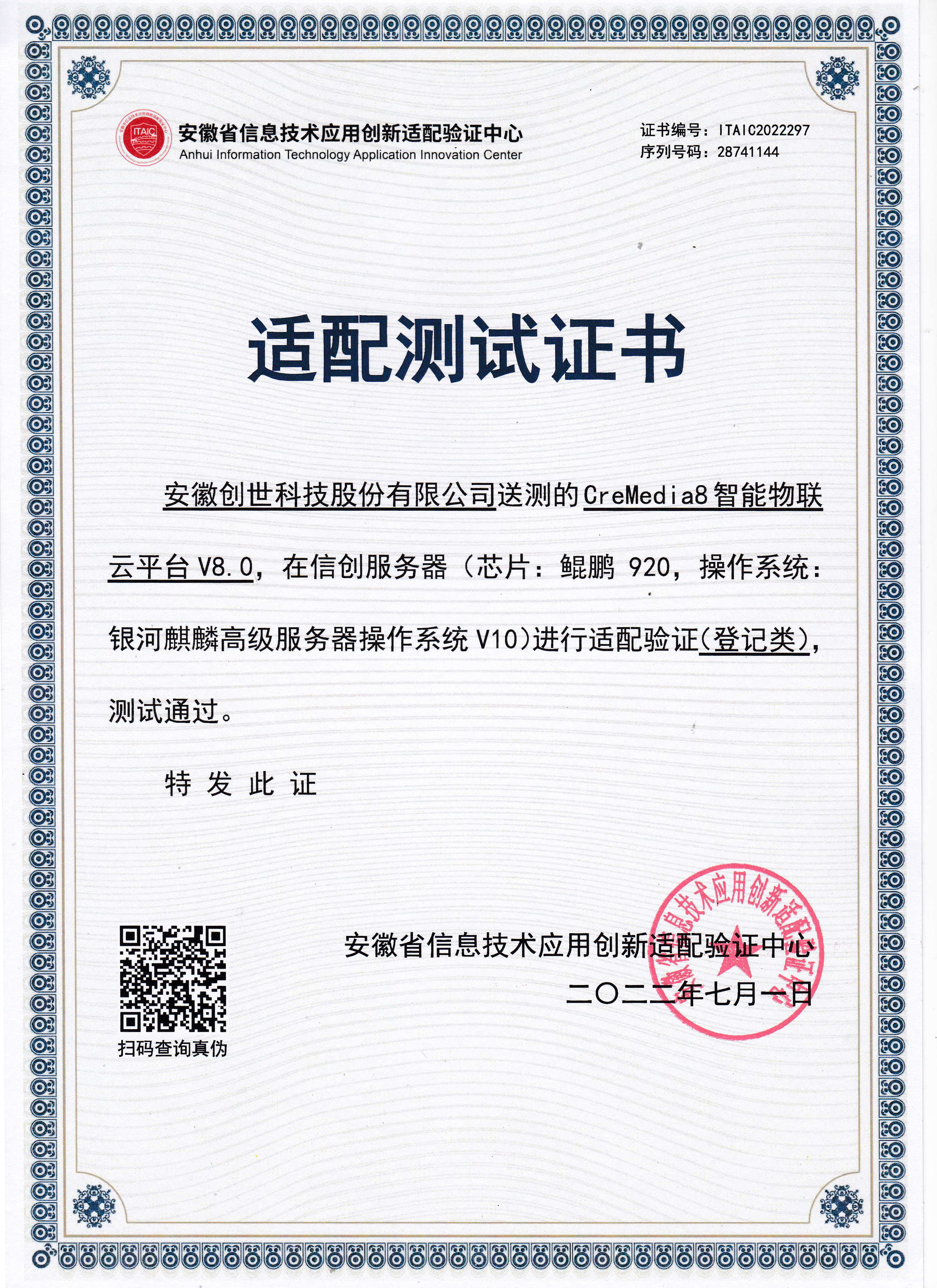 創(chuàng)世科技作為安防行業(yè)砥礪創(chuàng)新的踐行者,為響應(yīng)國(guó)家戰(zhàn)略,加快信息自主安全的建設(shè)規(guī)劃,打造安防行業(yè)國(guó)產(chǎn)化生態(tài)圈。近日,創(chuàng)世科技自主研發(fā)的“CreMedia8智能物聯(lián)云平臺(tái)”正式通過(guò)安徽省信息技術(shù)應(yīng)用創(chuàng)新適配驗(yàn)證中心的適配認(rèn)證,產(chǎn)品符合信創(chuàng)環(huán)境需要,能在多個(gè)不同國(guó)產(chǎn)環(huán)境下穩(wěn)定運(yùn)行,性能達(dá)標(biāo)、安全可靠,順利獲得*、專業(yè)的省級(jí)適配測(cè)試證書(shū),積*推進(jìn)國(guó)產(chǎn)化操作系統(tǒng)在移動(dòng)視頻監(jiān)控領(lǐng)域的深根落地。