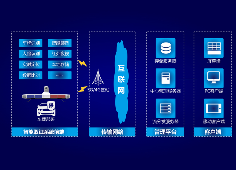 本系統(tǒng)由一體化智能警燈、傳輸網(wǎng)絡(luò)、視頻綜合管理平臺軟件、客戶端四大部分組成。基于5G無線傳輸?shù)闹悄苋∽C系統(tǒng),前端設(shè)備對路邊違停車輛進(jìn)行自動抓拍,對違法變道、占用公交車道等交通違法行為進(jìn)行手動抓拍,對道路視頻進(jìn)行實(shí)時采集;通過5G網(wǎng)絡(luò)將違法圖片、違法視頻和實(shí)時視頻傳輸?shù)焦芾砥脚_;管理平臺對數(shù)據(jù)進(jìn)行分類、統(tǒng)計和存儲;后臺工作人員可以通過客戶端對違法圖片和違法視頻進(jìn)行查看和審核,同時可以通過實(shí)時視頻遠(yuǎn)程了解現(xiàn)場情況。