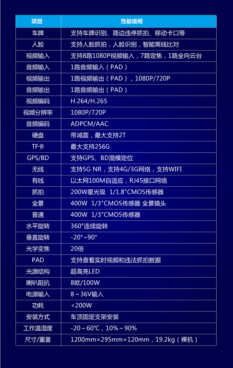 一體化智能警燈,采用一體化結(jié)構(gòu)設(shè)計、嵌入式Linux操作系統(tǒng),是針對警用執(zhí)法、應(yīng)急指揮開發(fā)的專用智能警用終端。可實(shí)現(xiàn)本地高清錄像存儲、5G/WIFI無線網(wǎng)絡(luò)傳輸、支持北斗/GPS雙模定位、支持遠(yuǎn)程控制、車牌識別、人臉識別及警燈和警號的功能??梢詰?yīng)用在違停抓拍、違法抓拍、移動卡口、限號抓拍等場景。